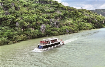走进景区,前来游峡谷、看大桥的游客络绎不绝。在景区工作人员的引导下,游客们有序排队购票、乘船。随着渡轮在北盘江上前行,穿梭于有着“地球裂缝”之称的花江大峡谷之间,远山近水,峭壁陡崖,让人切身感受到大自然的鬼斧神工,游客不禁拿出手机、相机去定格一个个如画美景。